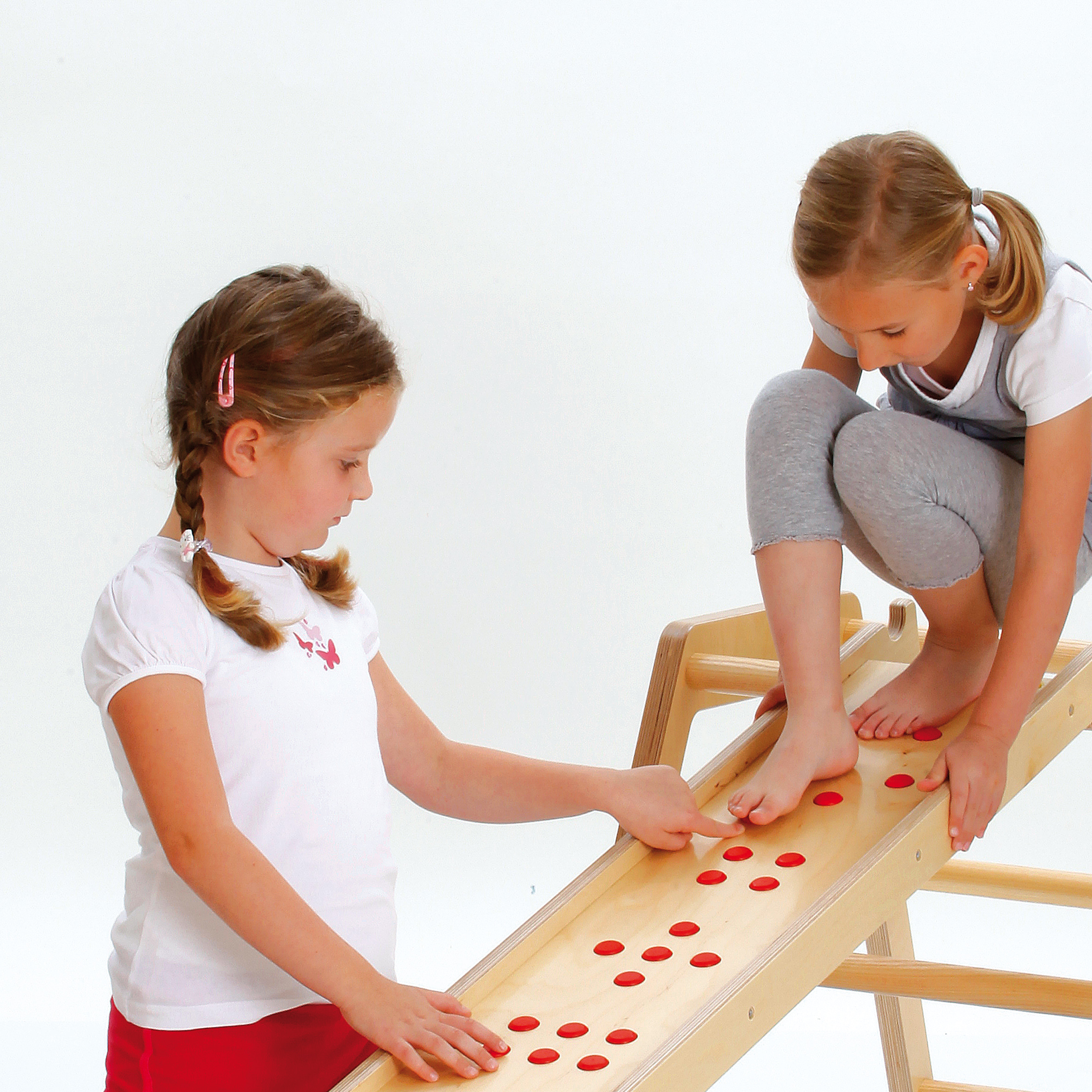 Auf diesem Brett sind insgesamt 55 Steine angebracht. Die 10 Zahlenfelder repräsentieren jeweils eine Zahl von 1 bis 10. Dieses Balancierbrett ist ideal zum Zählen und Rechnen geeignet. Es bietet sich besonders für Kinder mit Sehbehinderung an oder für das Balancieren mit verbundenen Augen. Die Stimulation der Hand- und Fußflächen beim Gebrauch ist angenehm und fördert die Durchblutung.