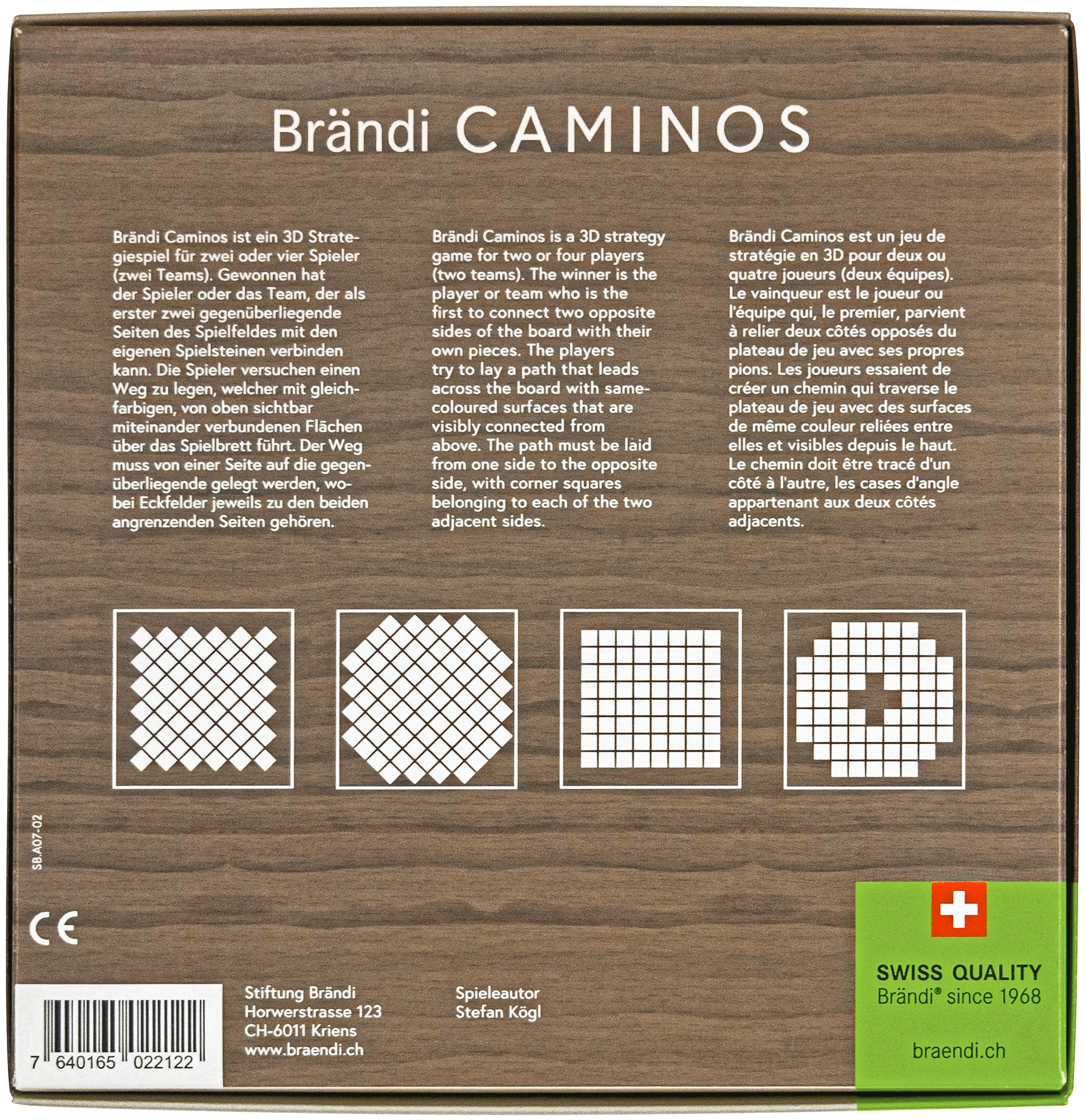 Bei der neuen Version des Brändi Caminos wurden das Material und Design optimiert. Für den Holzrahmen und die Spielsteine werden unbehandeltes Holz verwendet. Die Spielsteine sind aus verschiedenfarbigem Buchen-, Ahorn und Nussbaumholz und verleihen dem Caminos eine wertigere Haptik. Für die austauschbaren Spielfelder wurde ökologischer und vollständig recyclebarer Kraftkarton gewählt. Ausserdem nehmen Sie das Spiel mit dem neuen Stoffbeutel einfach überall mit.