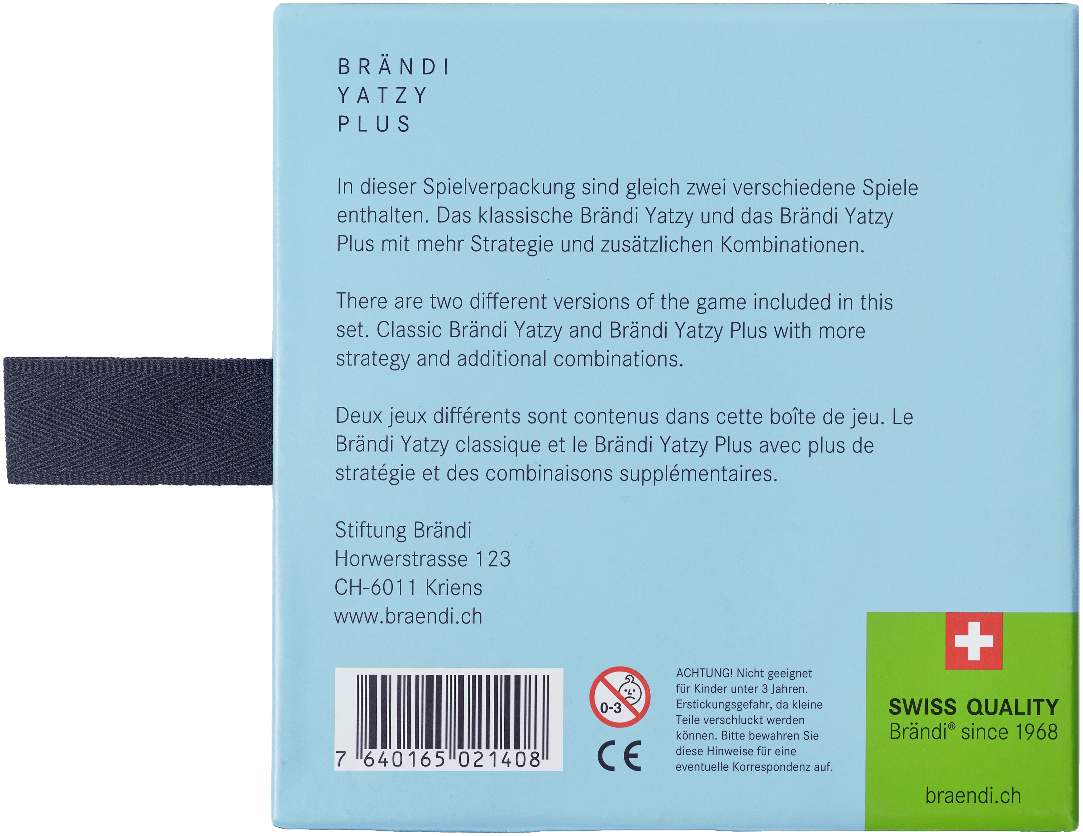 Glück allein reicht nicht – hier sind Taktik und Köpfchen gefragt! In dieser Spielbox stecken gleich zwei Spiele: das klassische Brändi-Yatzy und das strategischere Brändi-Yatzy Plus mit zusätzlichen Kombinationen. Freuen Sie sich auf viele aufregende Würfelpartien!