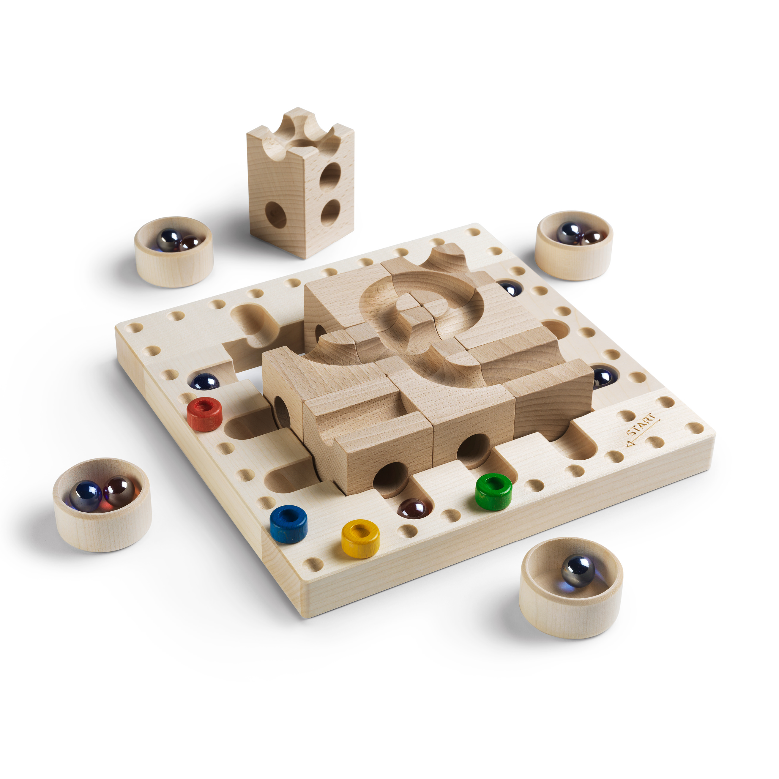 Das Kugelbahnsystem besteht aus über 100 verschiedenen CUBORO Elementen mit unterschiedlichen Funktionen. CUBORO fordert Kinder und Erwachsene entsprechend ihren Fähigkeiten, weckt Experimentierfreude und unterstützt das logische Denken. Das Kugelbahnsystem trainiert die Feinmotorik, stärkt das räumliche Vorstellungsvermögen und regt die Kreativität an. Das CUBORO-Spielzeug wird aus naturbelassenem Schweizer Holz in der Schweiz hergestellt.