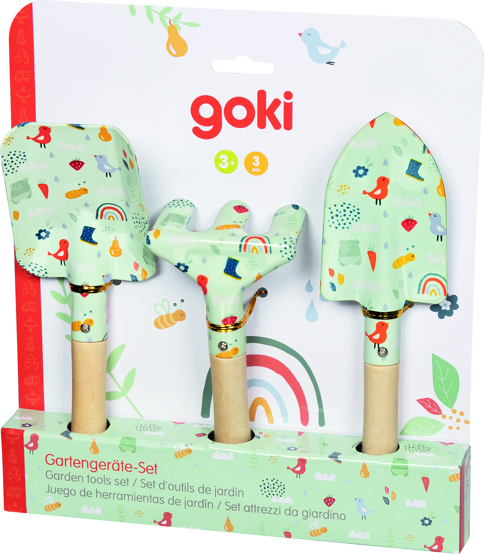 Dreiteiliges Gartenset für Kinder in liebevollem Design: wer mit zwei Schaufeln und einer Harke ausgestattet ist, kann in Frühling und Sommer auf dem Balkon oder im Garten fleissig helfen. Mit Holzgriff und ohne scharfe Kanten. 3-fach sortiert.
