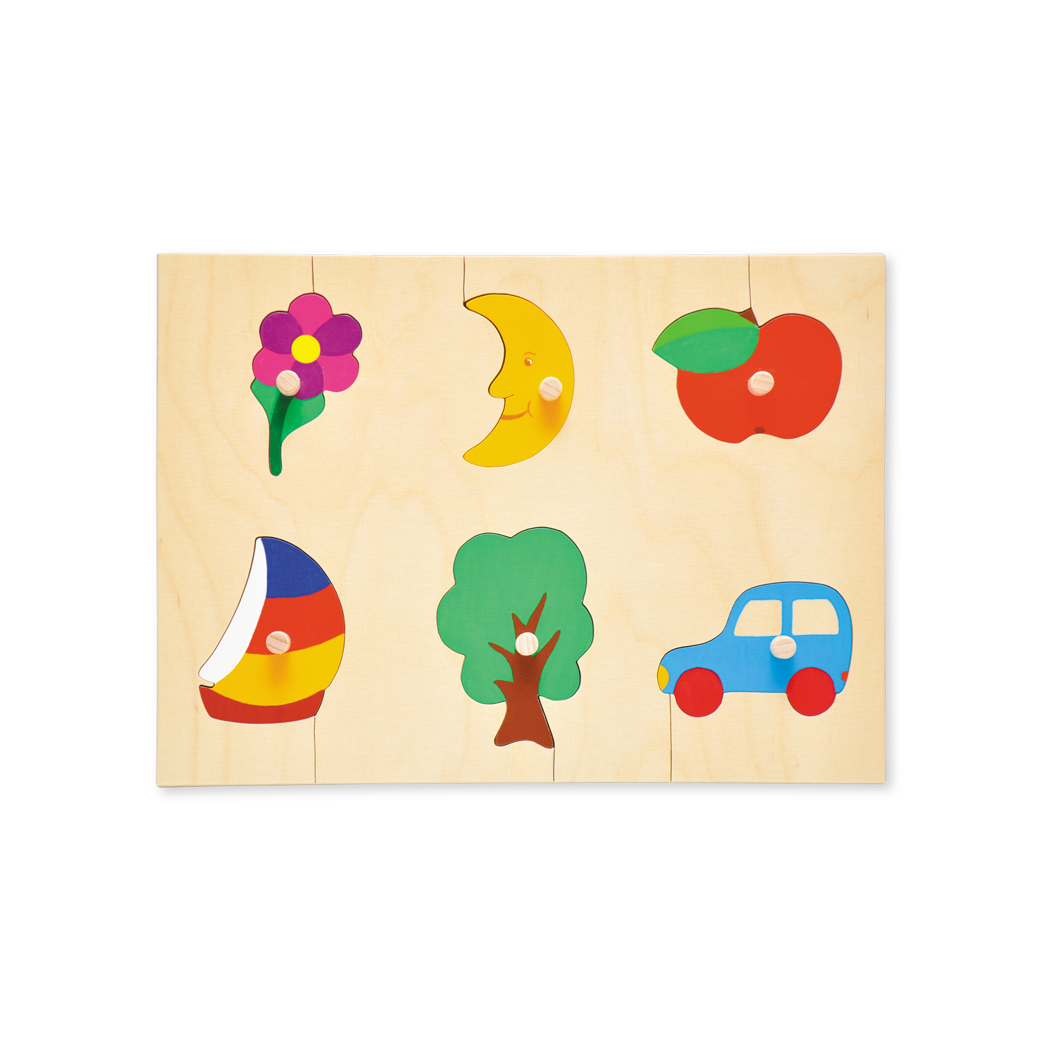 Das handbemalte Griffpuzzle mit seinen bunten Motiven ist ideal, um die Feinmotorik Ihres Kindes zu fördern. Es besteht aus 6 Teilen mit Motiven wie einer Blume, einem Mond, einem Apfel, einem Schiff, einem Baum und einem Auto. Das Puzzle ist eine unterhaltsame und lehrreiche Aktivität für kleine Kinder, die ihre Hand-Augen-Koordination und ihre Problemlösungsfähigkeiten entwickeln möchten.