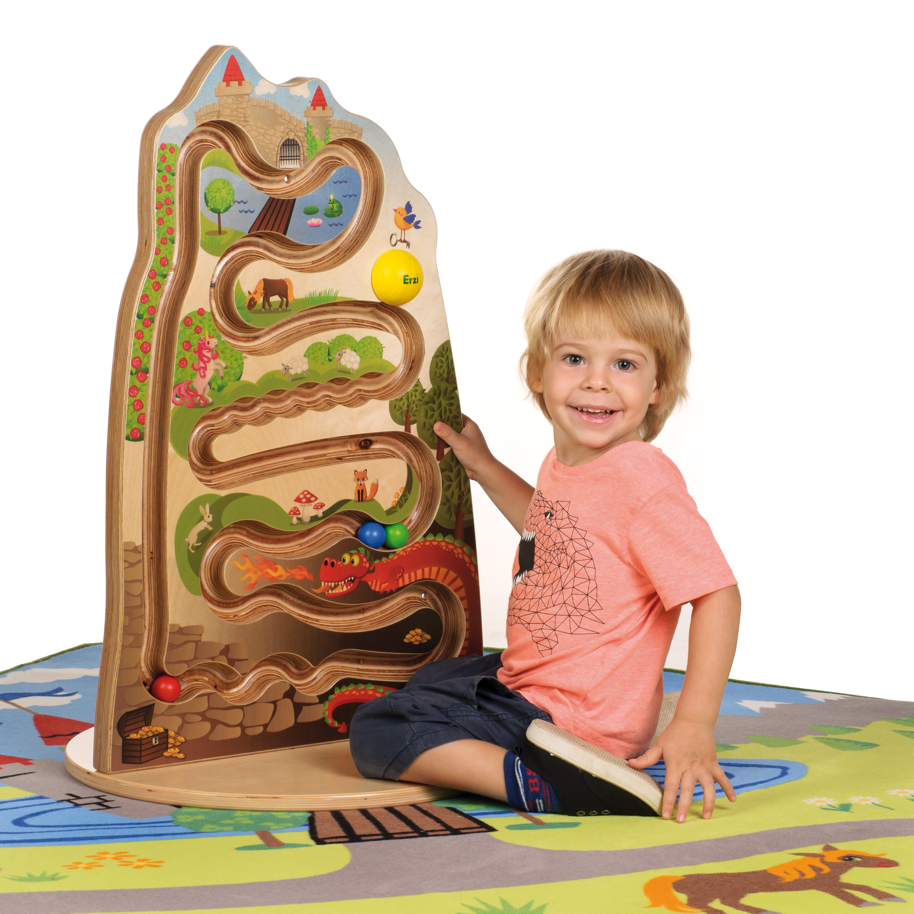 Die Kugelbahnen von Erzi sind perfekt geeignet für Gruppenräume, Wartezimmer oder Foyers und ziehen mit ihrer Optik sofort alle Blicke auf sich. Mit drei farbigen Holzkugeln können die Kinder eine aufregende Reise durch den Märchenwald erleben. Die Kugeln rollen entlang an Schlössern und Drachen und erleben dabei spannende Abenteuer. Dank der sorgfältig gestalteten Bahnen bleiben die Kugeln immer sicher in ihrer Spur und sorgen für grossen Spielspass. Mit der Erzi - Bodenplatte (Art.-Nr. 51004) kann die Kugelbahn frei im Raum aufgestellt werden.Inhalt:1 Spielplatte mit 3 Kugeln, Montagematerial