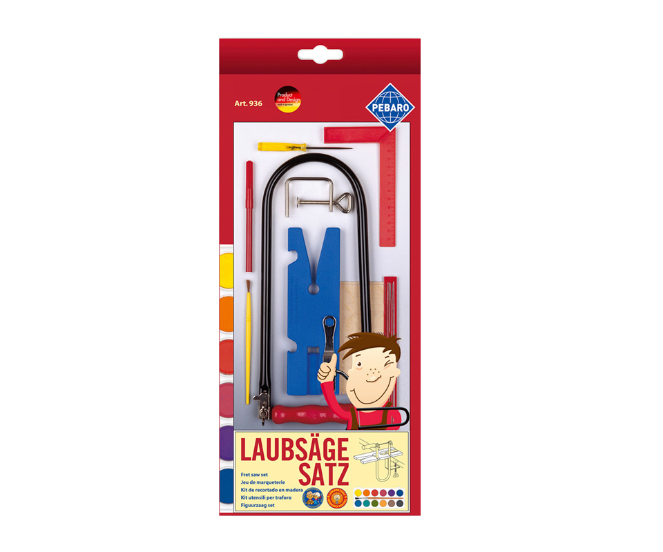 - Enthält eine Laubsäge, ein Laubsägetischchen mit Einspannhalterung, eine Zwinge, Laubsägeblätter, einen Laubsägeschlüssel, eine Holzvorlage, eine Ahle, einen Winkel, einen Pinsel, einen Stift, einen Farbmalkasten und eine Anleitung.