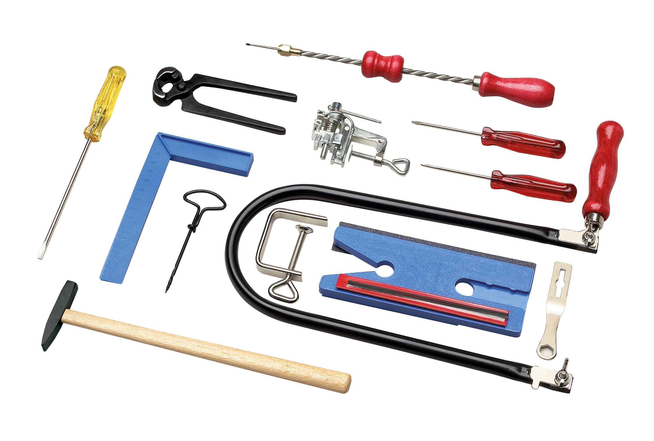 - Inhalt: Das Set beinhaltet eine Laubsäge, Brettchen, Zwinge, Blätter, Schlüssel, Winkel, Ahle, Rundfeile, Drillbohrer, Nagelbohrer, Schraubstock, Stahlzange, Hammer, Schraubendreher (Schlitz), Schleifpapier und eine Anleitung.