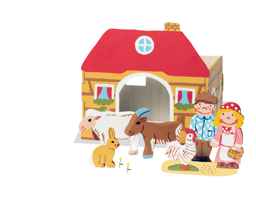- Eine kreative Sperrholzvorlage, mit dem Motiv "Bauernhof I", bereit zum Aussägen mit einer Laubsäge.