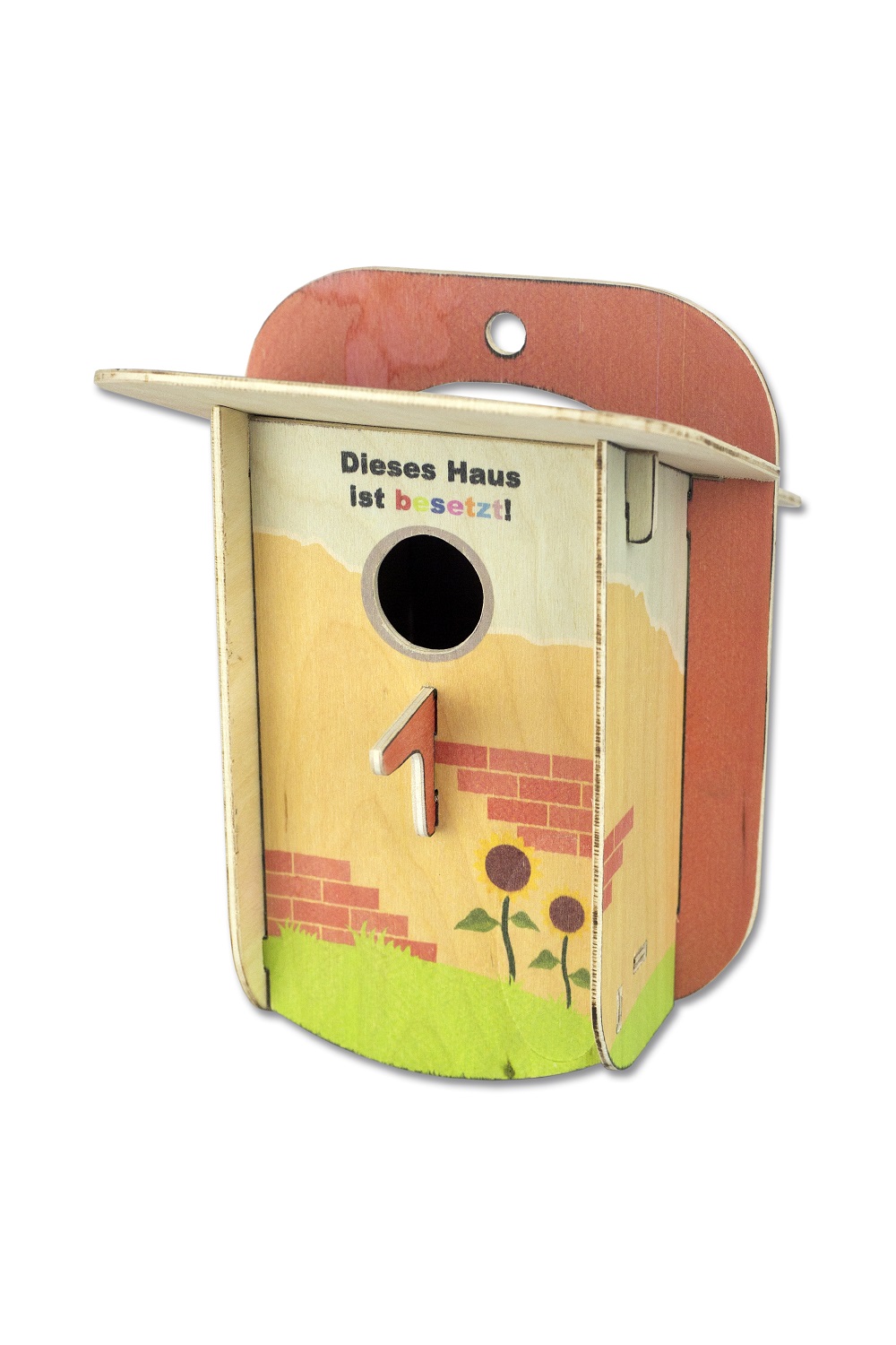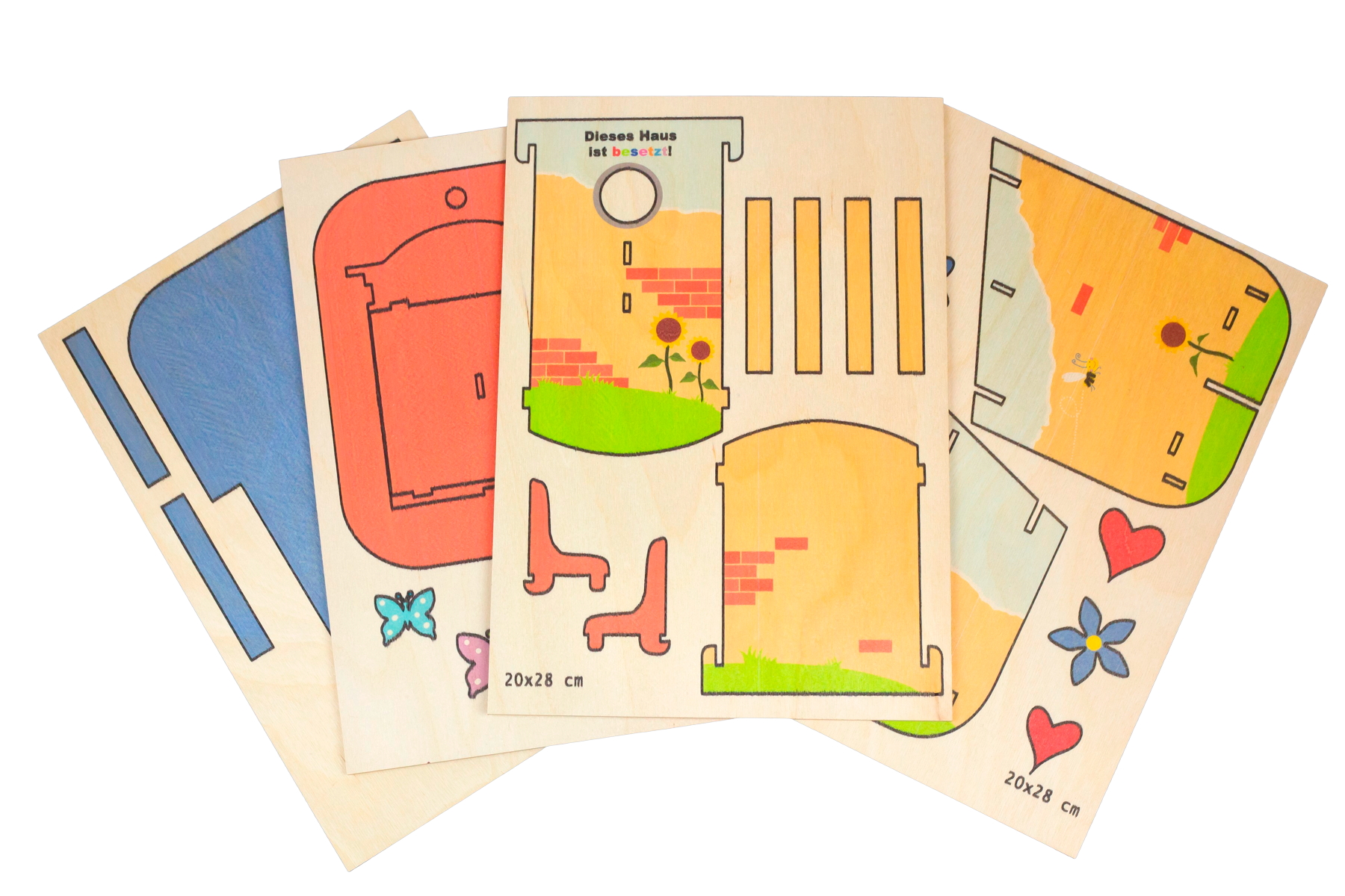 - Eine kreative Sperrholzvorlage, mit dem Motiv "Vogelhaus bunt", bereit zum Aussägen mit einer Laubsäge.