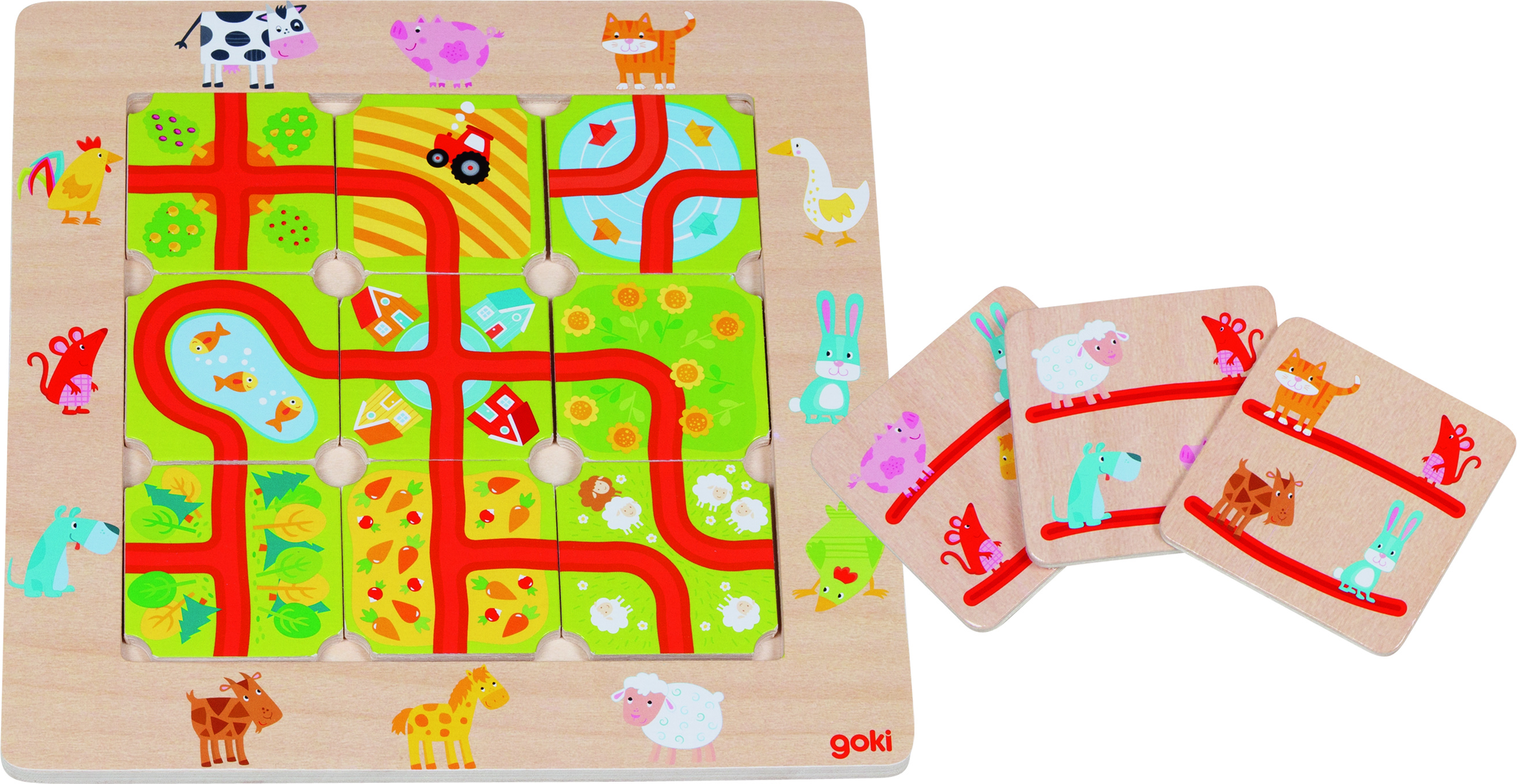 Zwölf ganz unterschiedliche Tiere leben in der Umgebung eines kleinen Dorfes. Obwohl sie einander sehr verbunden sind, treffen sie sich nur selten, da die Wege ihre Besuche erschweren. Eure Aufgabe ist es, den Tieren zu helfen, häufiger zueinander zu finden, indem ihr neue Pfade durch Felder und Wiesen anlegt. Das Puzzlespiel „Finde den Weg“ besteht aus einem robusten Holzrahmen, der Platz für neun Puzzleteile bietet, sowie aus 20 Vorlagetafeln.