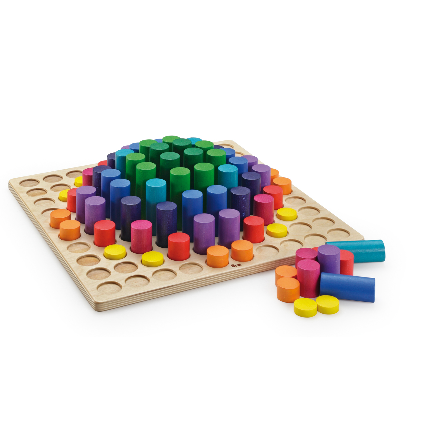 10x10 Zylinder (Ø36 mm) in den Höhen 10 bis 100 mm zur Mengenlehre. Das Steckbrett ermöglicht vielfältige Zusammenstellungen und Anordnungen der farbigen Steine, von Farbharmonien bis hin zu einfachen figürlichen Darstellungen. Jede Höhe hat ihre eigene Farbe, so dass bis zu 10 Kinder gleichzeitig mit einer Mengenfolge von 1 bis 10 arbeiten können. Dieses Spielzeug fördert das Verständnis für Farben, Zahlen und Muster sowie die Feinmotorik und die kognitive Entwicklung der Kinder.