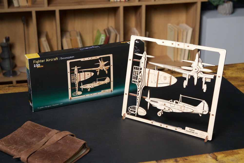 Ugears 2,5D-Puzzle Kampfflieger: Eine grossartige Alternative zu traditionellen PuzzlesEntdecken Sie das neue 2,5D-Puzzle Kampfflieger von Ugears, ein Holzmodell mit beweglichen Teilen und eigenem Rahmen. Das Modell stellt eine klassische Spitfire der 1940er Jahre dar und zeigt drei Perspektiven (Vorderansicht, Draufsicht und Seitenansicht). Bewegliche Teile wie Querruder, Propeller, Räder und Cockpithaube erwecken das Bild zum Leben.