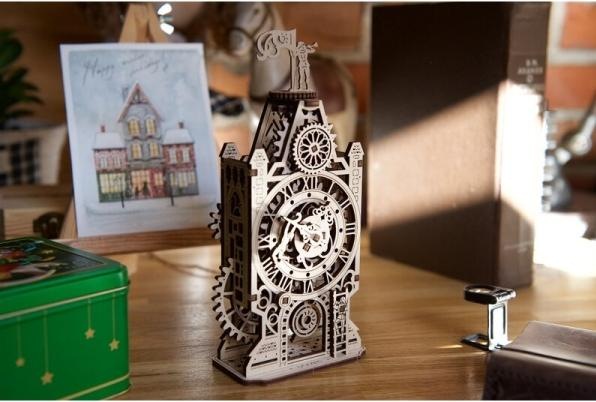 Der Alte Uhrenturm ist eine weitere faszinierende Uhr in der Ugears-Kollektion. Dieses zauberhafte Mini-Modell aus Holz bringt mittelalterliches Flair in Ihr Zuhause oder Büro. Der Modellbausatz besteht aus einem Turm mit Ziffernblatt, beweglichen Zahnrädern, einem Pendel, Figuren und einer Wetterfahne. Drehen Sie das grosse Zahnrad, um die Uhrzeiger, das Pendel und die Wetterfahne in Bewegung zu setzen. Die Wetterfahne zeigt einen Trompeter mit flatterndem Banner. Ein kleiner Mann klammert sich verzweifelt an den Minutenzeiger, während ein anderer eine Leiter erklimmt. Eine verdächtige Gestalt schleicht durch eine versteckte Tür – ist es ein Dieb oder ein buckliger Glöckner? Während des Mittelalters und der Renaissance waren Uhrentürme wichtige Zeitmesser und Symbole des Wohlstands.