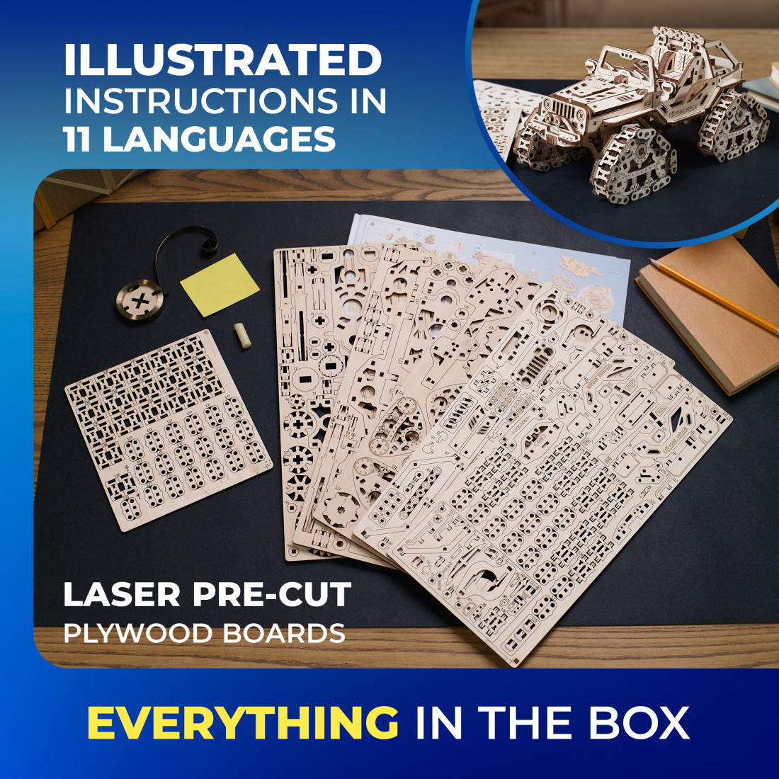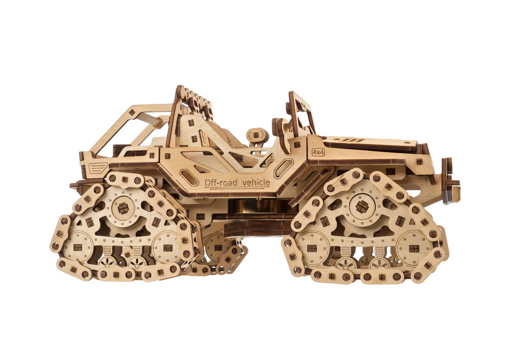 Dieses 3D-Puzzle eines offenen Jeeps mit Kettenantrieb ist eine tolle Ergänzung der Ugears-Kollektion. Der beeindruckende Katalog bietet Modelle für jeden Geschmack, von Automaten über Roboter bis hin zu Fahrzeugen und Uhren. Wählen Sie dieses einzigartige Geländefahrzeug als Geschenk für Geländefahrer/innen oder zu besonderen Anlässen.