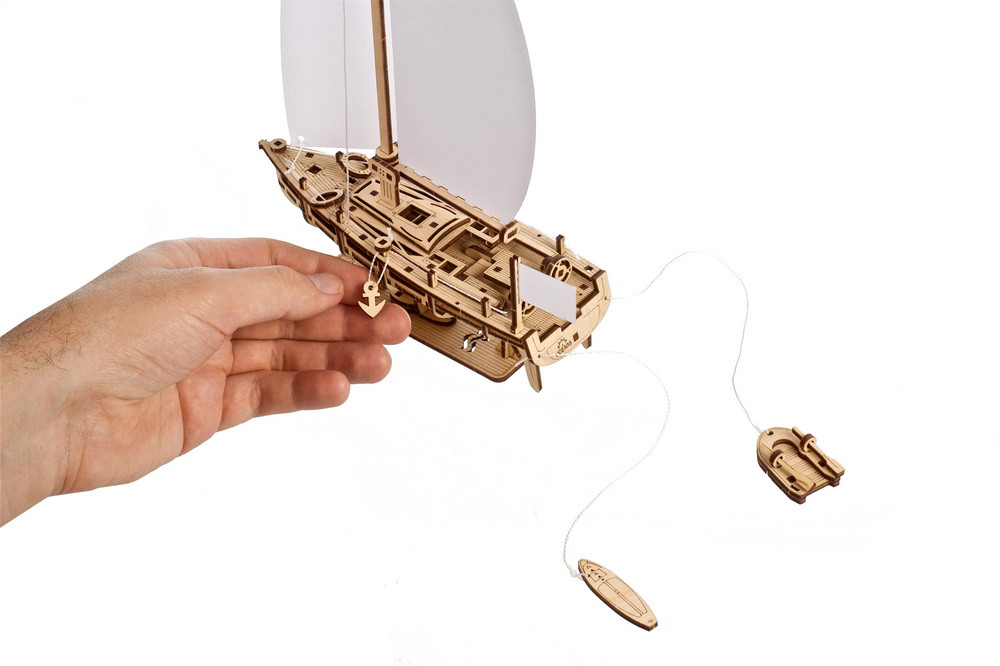 Das DIY-Jachtmodell verfügt über ein geschwungenes Grosssegel und einen Klüver, die beide an einem hohen Mast befestigt sind. Eine Reling aus Stützen und Schiffstau umgibt das Deck und verleiht dem Modell ein authentisches Aussehen. Zwei Rettungsringe, ein Anker und ein Fahnenmast am Heck ergänzen das realistische Design. Bemalen oder verzieren Sie die Papierflagge nach Belieben, um Ihre persönliche Note hinzuzufügen.