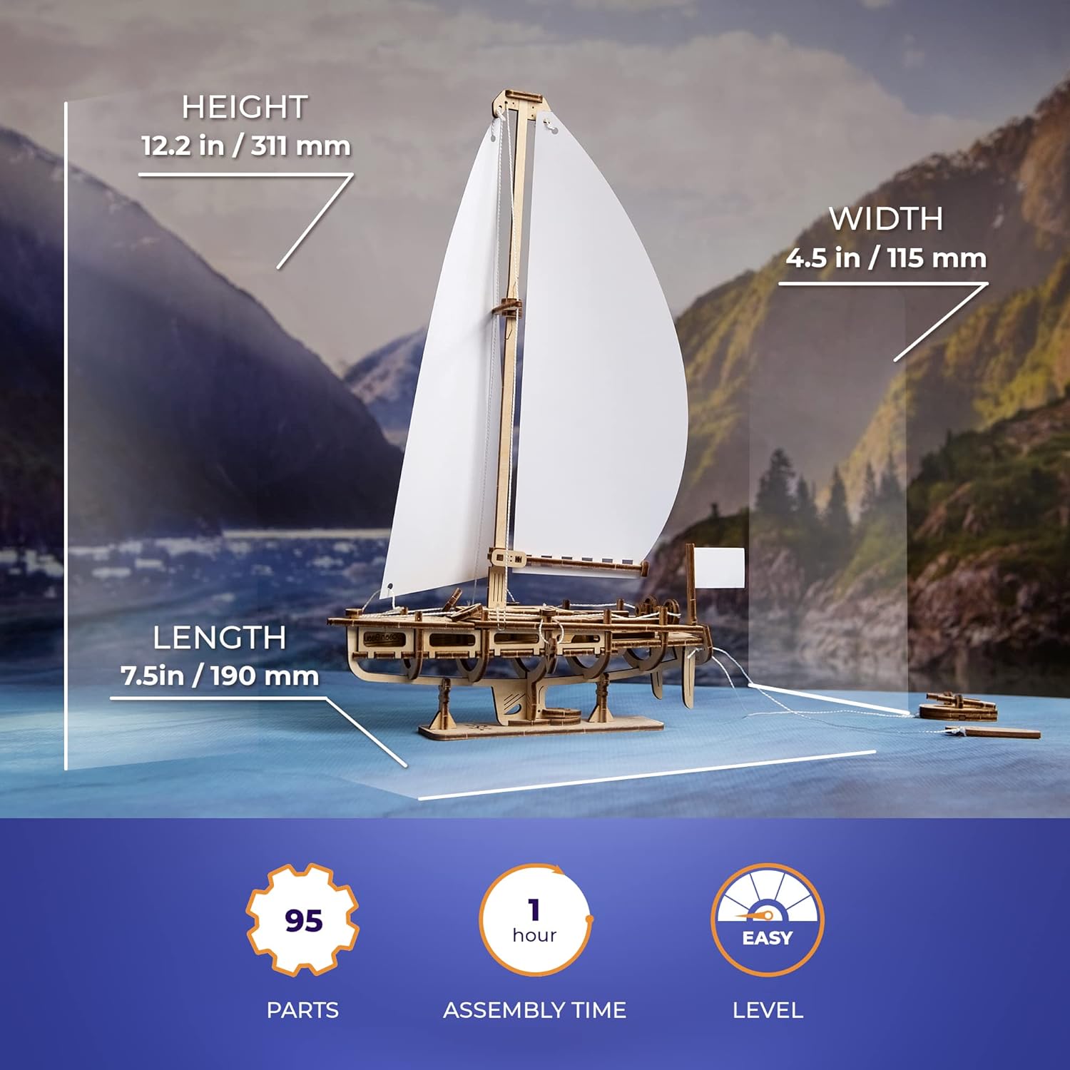 Fangen Sie den Wind ein und lassen Sie sich die Seeluft um die Nase wehen mit der sensationellen Jacht Ocean Beauty von Ugears. Dieses Segelboot-Holzbausatz ist ein beeindruckendes, statisches Modell mit zwei strahlend weissen Papiersegeln und einem stabilen Ständer, um es stilvoll auf Ihrem Schreibtisch oder im Regal zu präsentieren. Anders als andere mechanische Ugears-Modelle hat diese Jacht keine Zahnräder und keinen Motor. Stattdessen dient sie als dekoratives Element für Ihr Zuhause oder Büro.