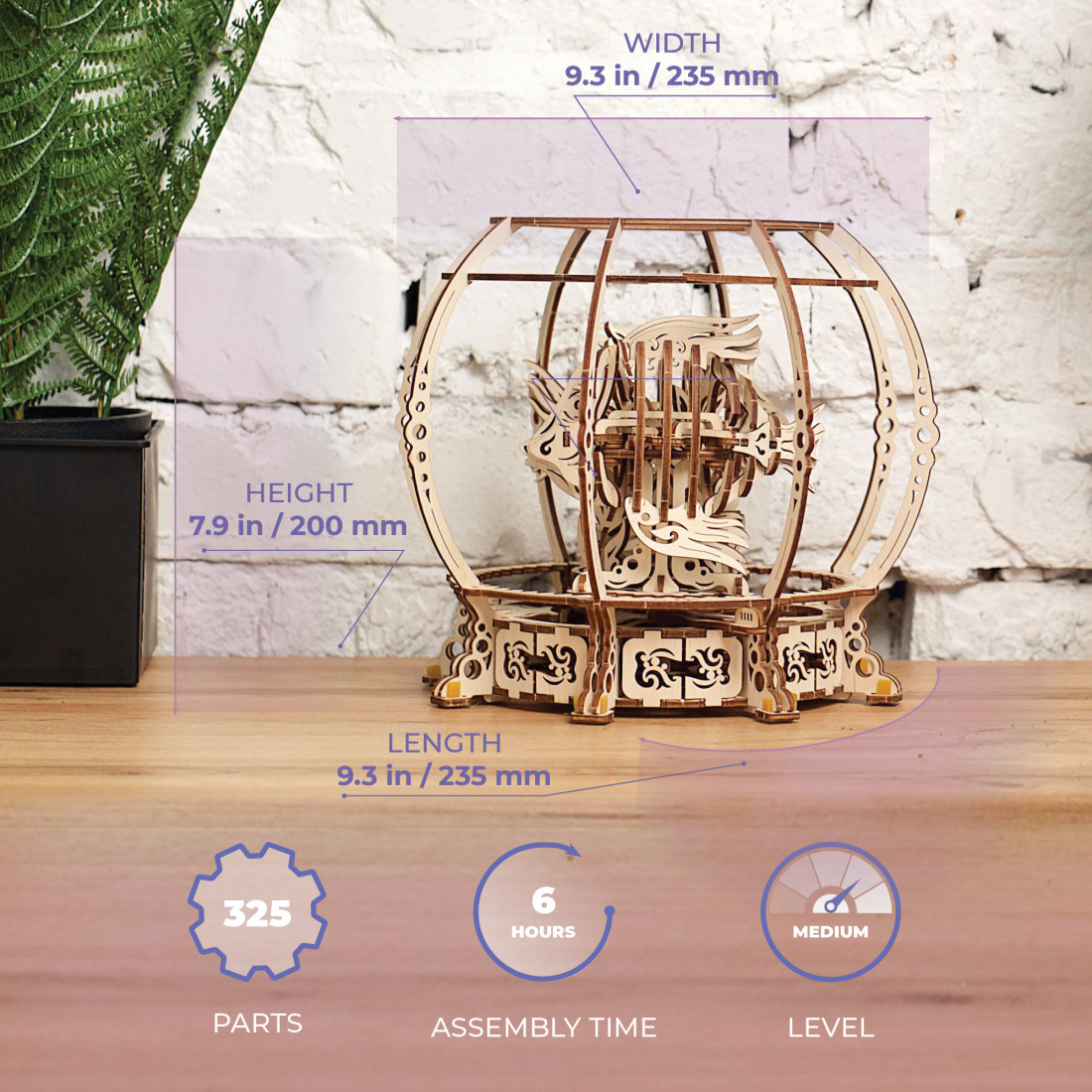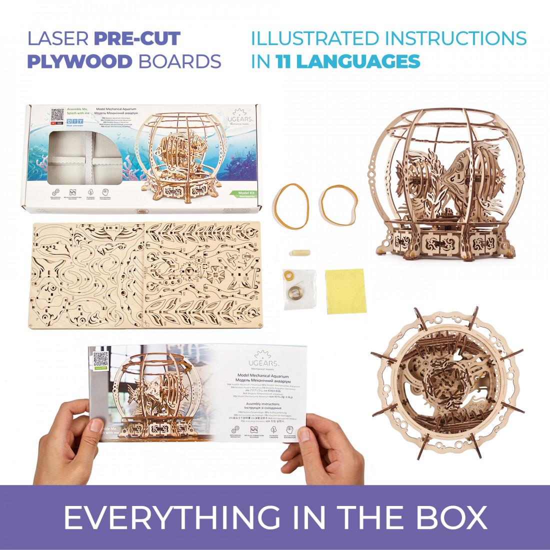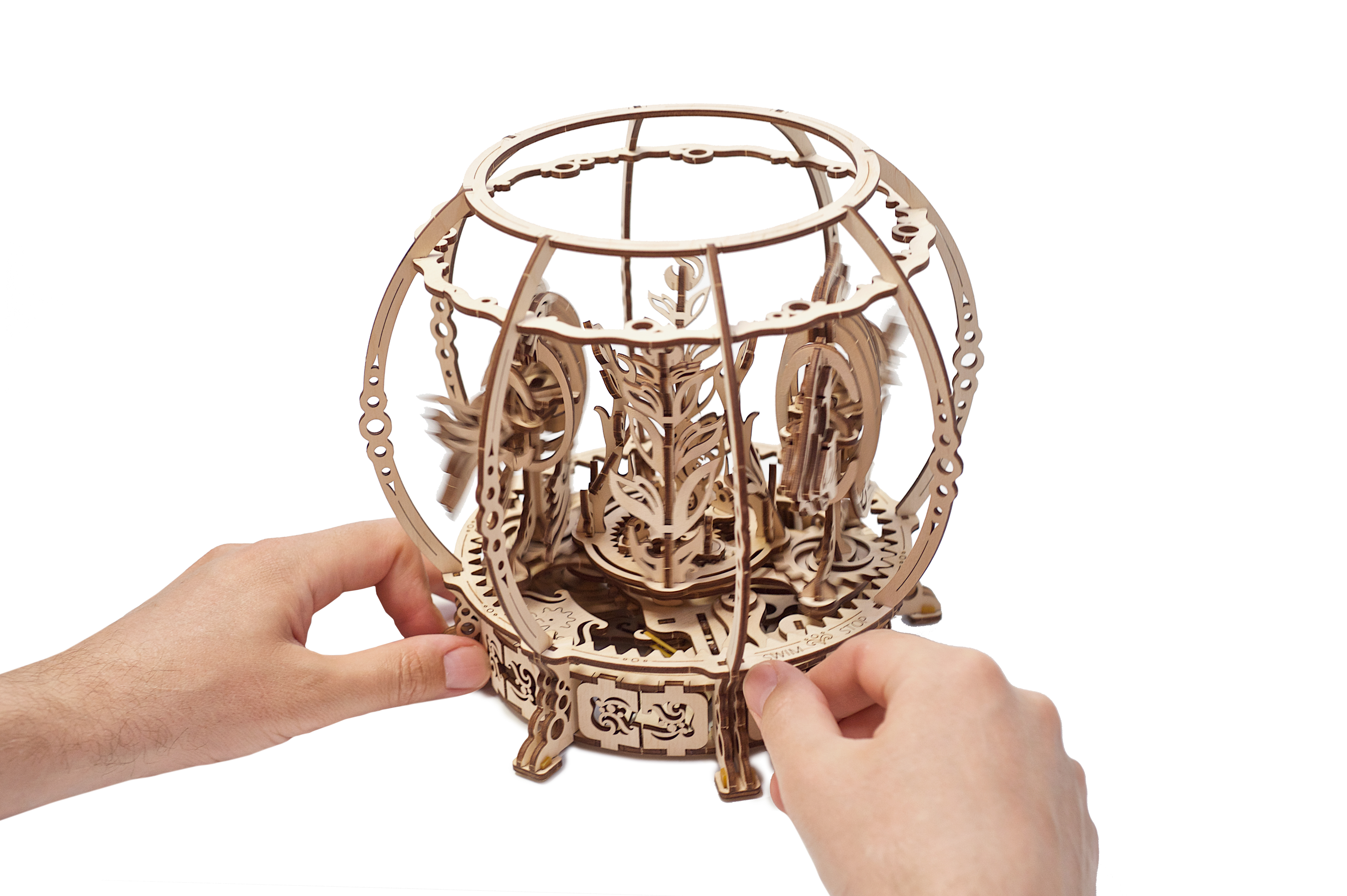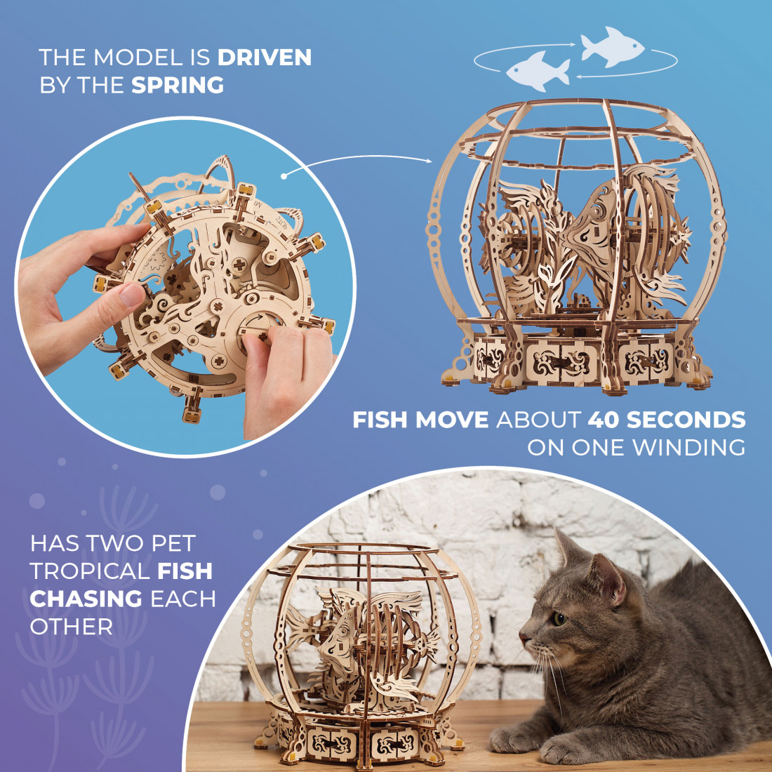 Anders als viele andere Ugears-Modelle wird das Mechanische Aquarium von einer Feder angetrieben, was die Lebensdauer und Wirkungsdauer verlängert. Um das Modell zu aktivieren, drehen Sie den Knauf unter dem Aquarium und schalten es auf „SWIM“, um die Bewegung zu starten. Ein Pendel im Inneren sorgt für gleichmässige und ruhige Bewegungen.