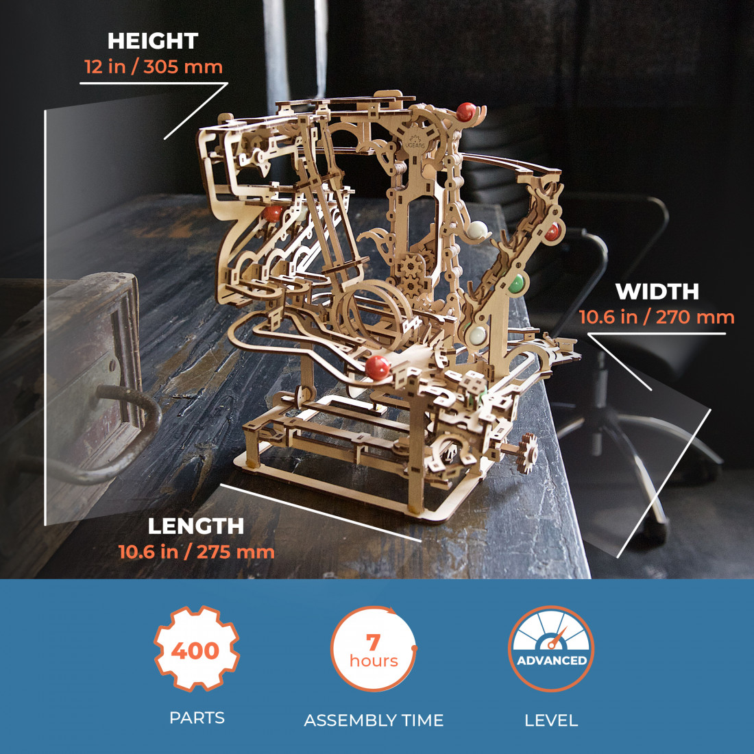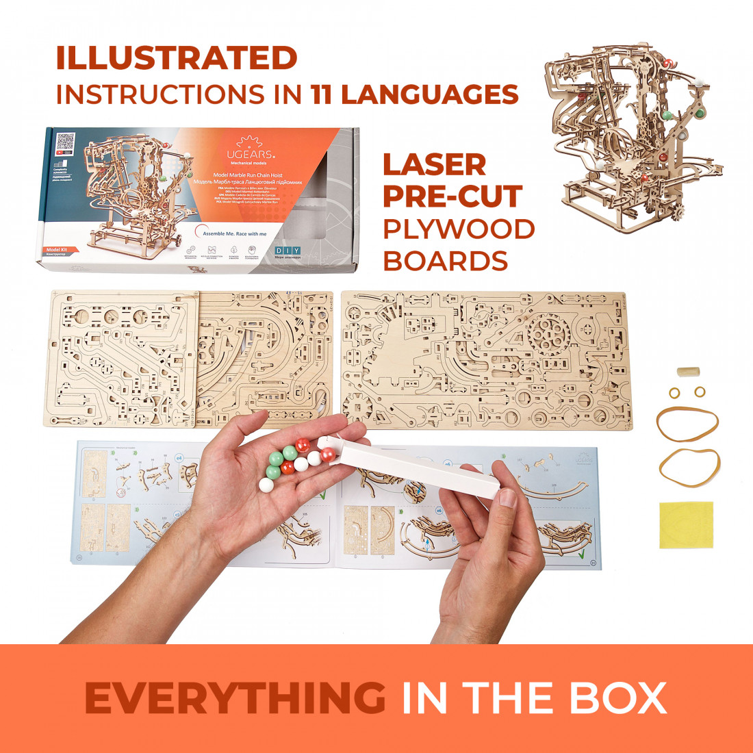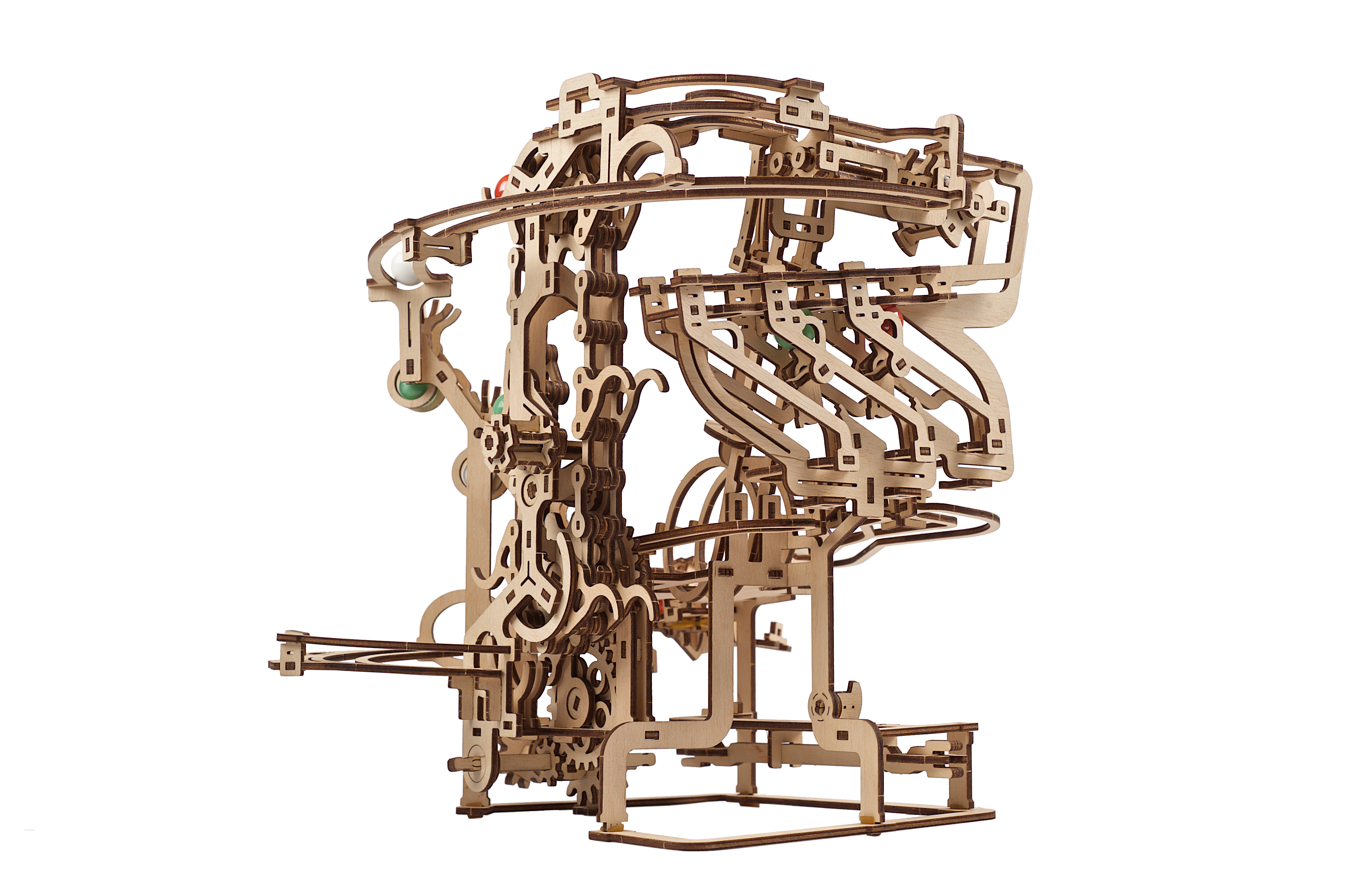 Wir präsentieren die neue DIY-Idee von Ugears: die Murmel-Kettenbahn. Diese Kombination aus Kunst und Technik ist sowohl eine kinetische Skulptur als auch ein raffiniertes Spielzeug. Ein Kettenzug, der per Handkurbel betätigt wird, befördert die Murmeln nach oben. Ein 3-Wege-Schalter verteilt sie auf verschiedene Bahnen, jede mit einzigartigen Hindernissen.