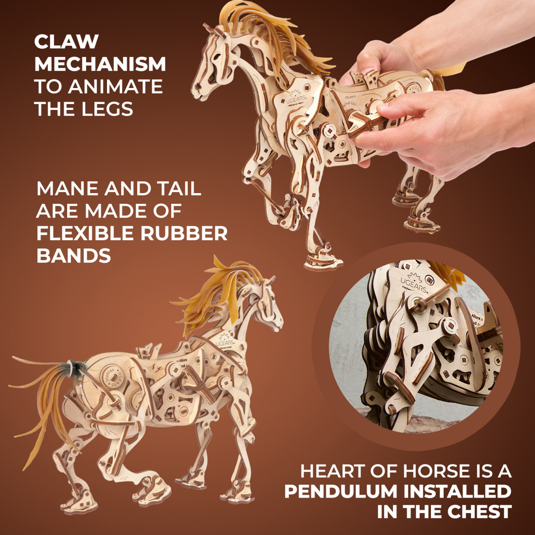 Ein innovativer Klauen-Mechanismus sorgt dafür, dass die Beine sich naturgetreu bewegen. Das Herzstück des Modells ist ein Pendel, das in der Brust des Pferdes montiert ist. Dieses Pendel verlangsamt die Energieübertragung des Gummimotors und verlängert so die Funktionsdauer. Obwohl das bionische Pferd nur eine begrenzte Strecke zurücklegt, bietet es genug Zeit, um die beeindruckende Mechanik zu beobachten. Mähne und Schweif, aus elastischen Gummibändern gefertigt, bewegen sich im Lauf des Pferdes im Wind.
