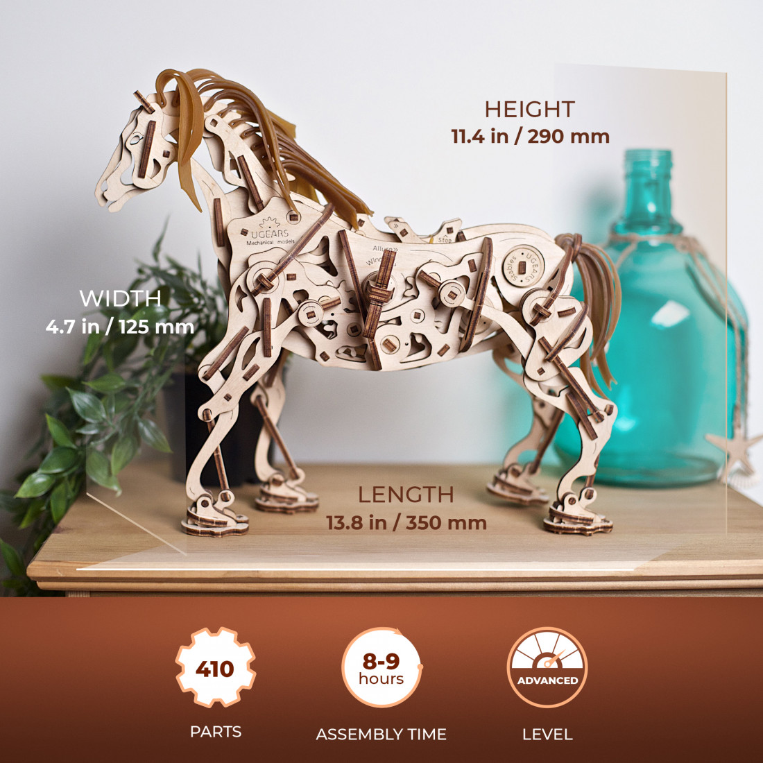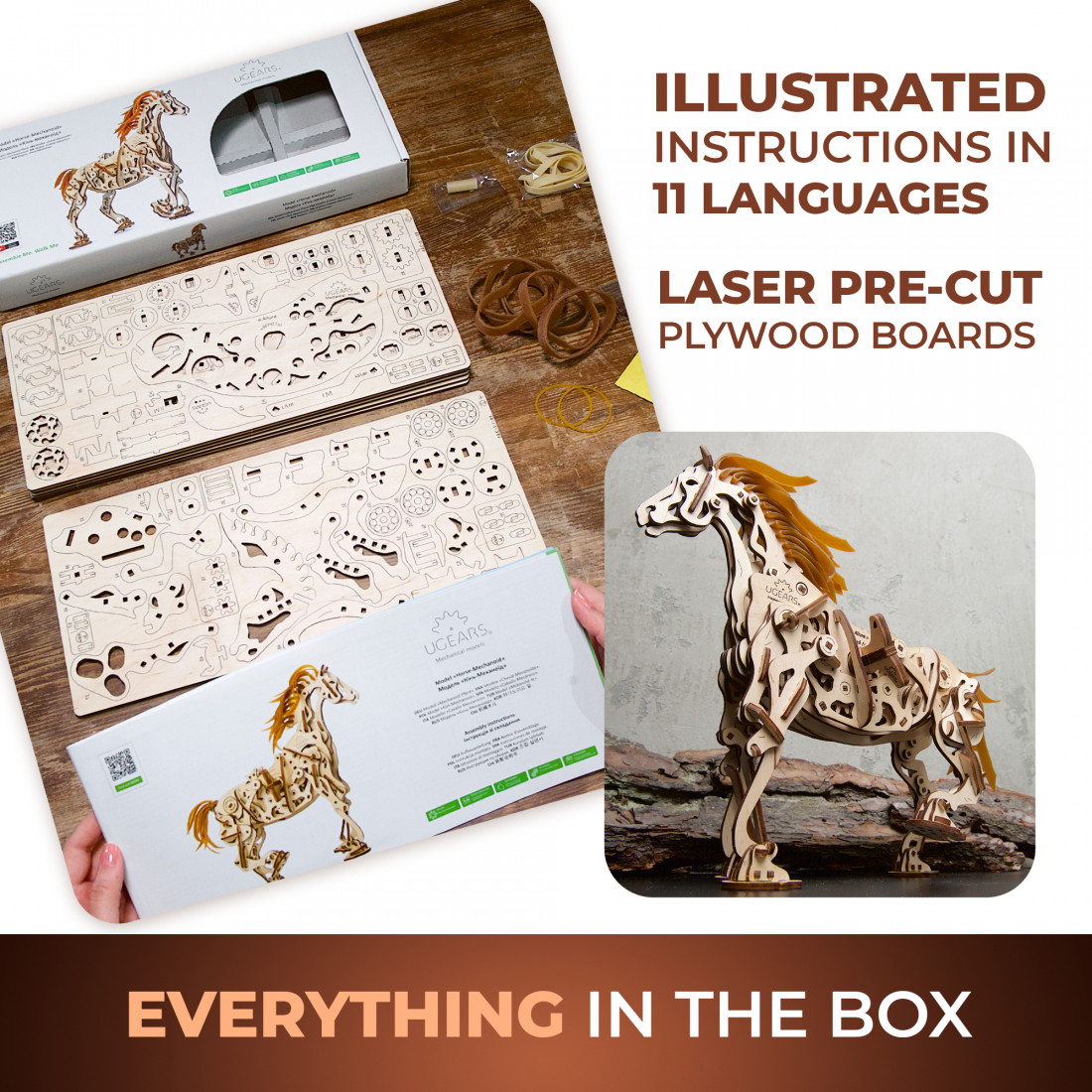 Dieses Modell ist eine Hommage an die frühen Automaten und Erfinder, von Griechenland bis zu Leonardo da Vinci. Mit dem Bionischen Pferd lädt Ugears dazu ein, der Hektik der modernen Welt zu entfliehen und eine entspannende, aber faszinierende Reise in die Vergangenheit zu unternehmen.