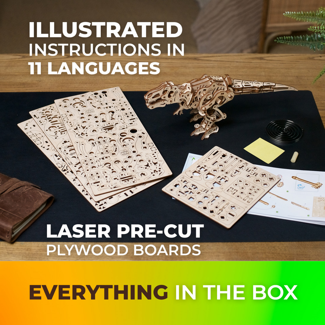 Das Modell besteht aus 249 Teilen und erfordert für den Zusammenbau etwa 8 Stunden. Es wird ohne Klebstoff oder spezielle Werkzeuge zusammengesetzt und folgt einer detaillierten Anleitung in 11 Sprachen. Der Schlüssel zum Aufziehen befindet sich an der Schwanzspitze und der T-Rex kann auf einer glatten Oberfläche selbstständig laufen. Mit seinem schwingenden Schwanz und den sich bewegenden Kiefern ist der Dinosaurier ein faszinierendes Beispiel für mechanische Ingenieurskunst.