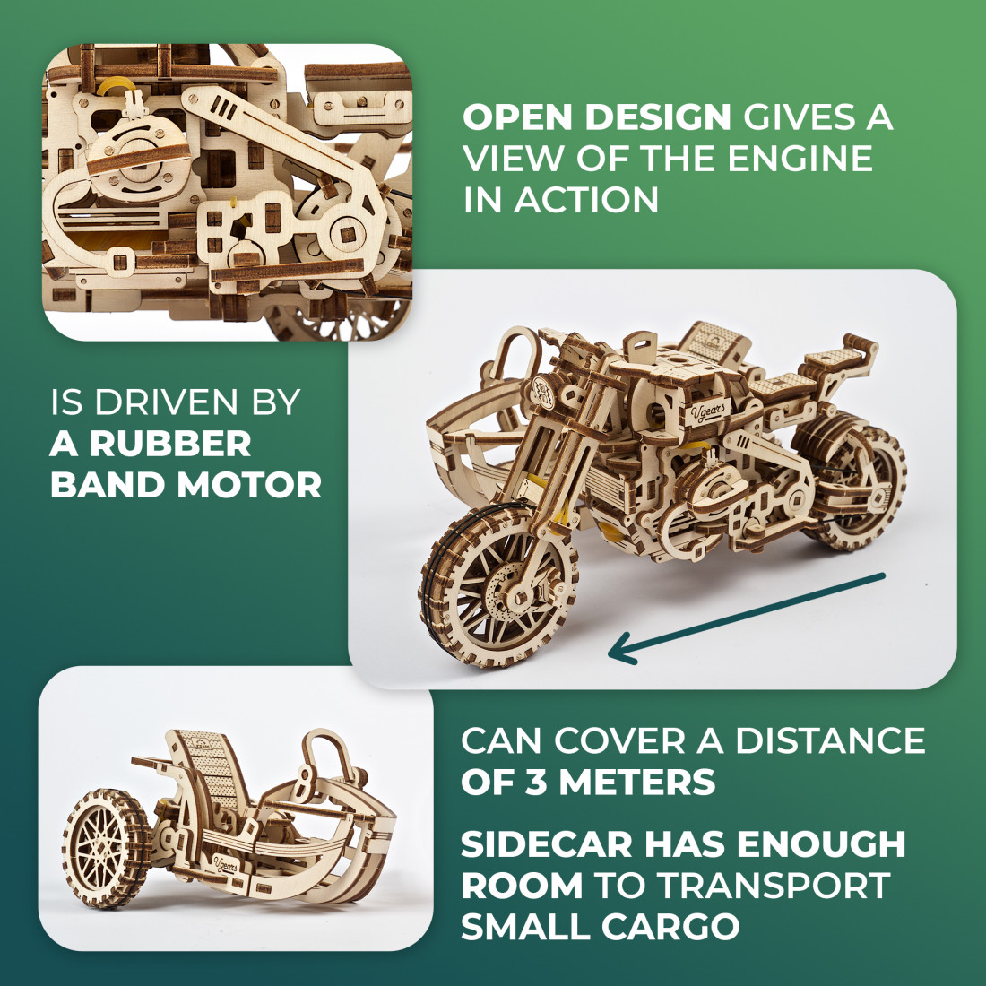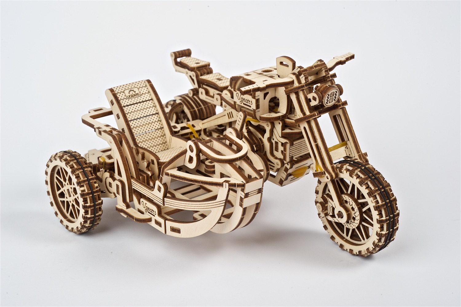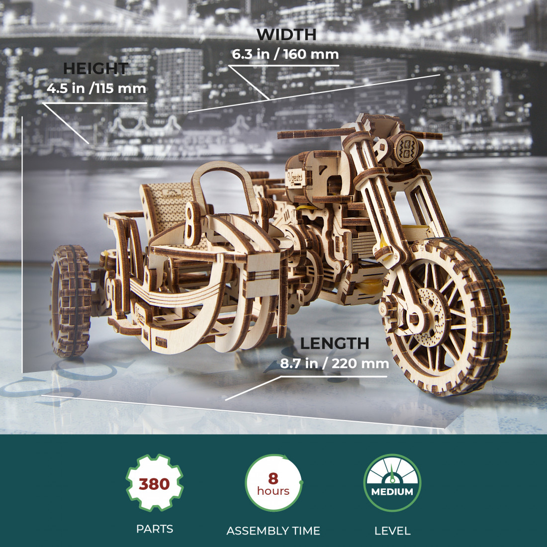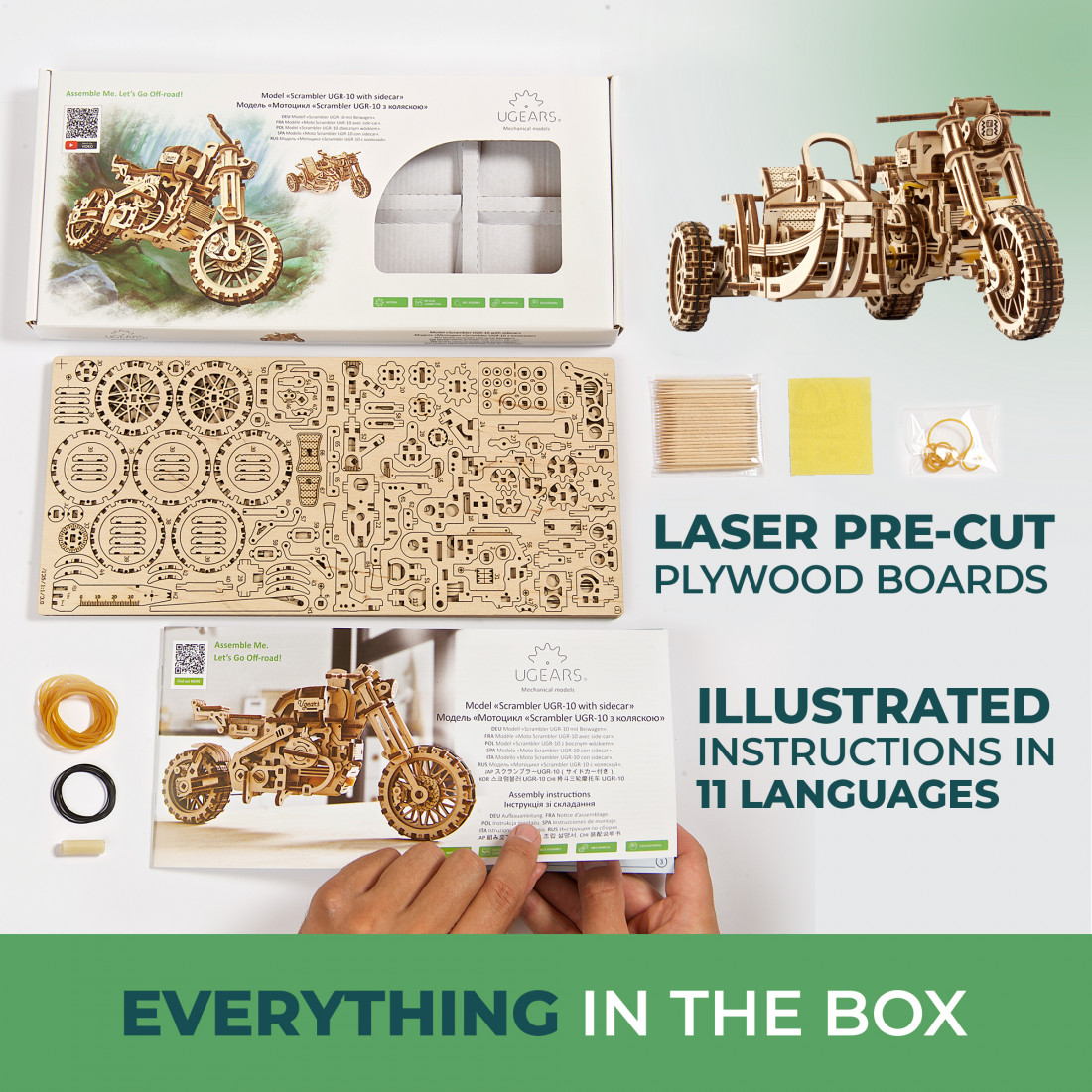 Der Ugears Scrambler UGR-10 mit Beiwagen ist ein detaillierter Modellbausatz von hoher Qualität, bestehend aus 380 präzise vorgefertigten Holzteilchen, die durch Laserschneiden auf die Platten gebracht wurden. Mit einem Schwierigkeitsgrad von „mittel“ und einer geschätzten Bauzeit von etwa 8 Stunden bietet der Bausatz ein spannendes Erlebnis. Für den Zusammenbau sind keine Klebstoffe oder Spezialwerkzeuge erforderlich – alles Notwendige finden Sie im Set. Der Zusammenbau dieses 3D-Puzzles bringt nicht nur Freude, sondern lässt Sie auch ein realistisches Retro-Design mit voll funktionaler Aufhängung geniessen.