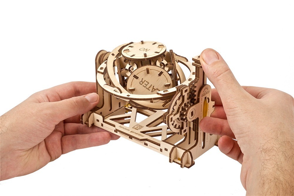 Funktionsweise: Der Zufallsgenerator besteht aus einem Würfel, der ein Oktaeder im Inneren enthält. In diesem Oktaeder befindet sich eine Metallkugel, die für Gewicht sorgt und die Zufälligkeit der Ergebnisse unterstützt. Das gesamte System wird durch eine Zahnstange und ein Ritzel angetrieben, die über ein dreiachsiges Zahnrad gesteuert werden. Um den Zufallsgenerator in Betrieb zu nehmen, wird das Gerät manuell über das angetriebene Getriebe bewegt.