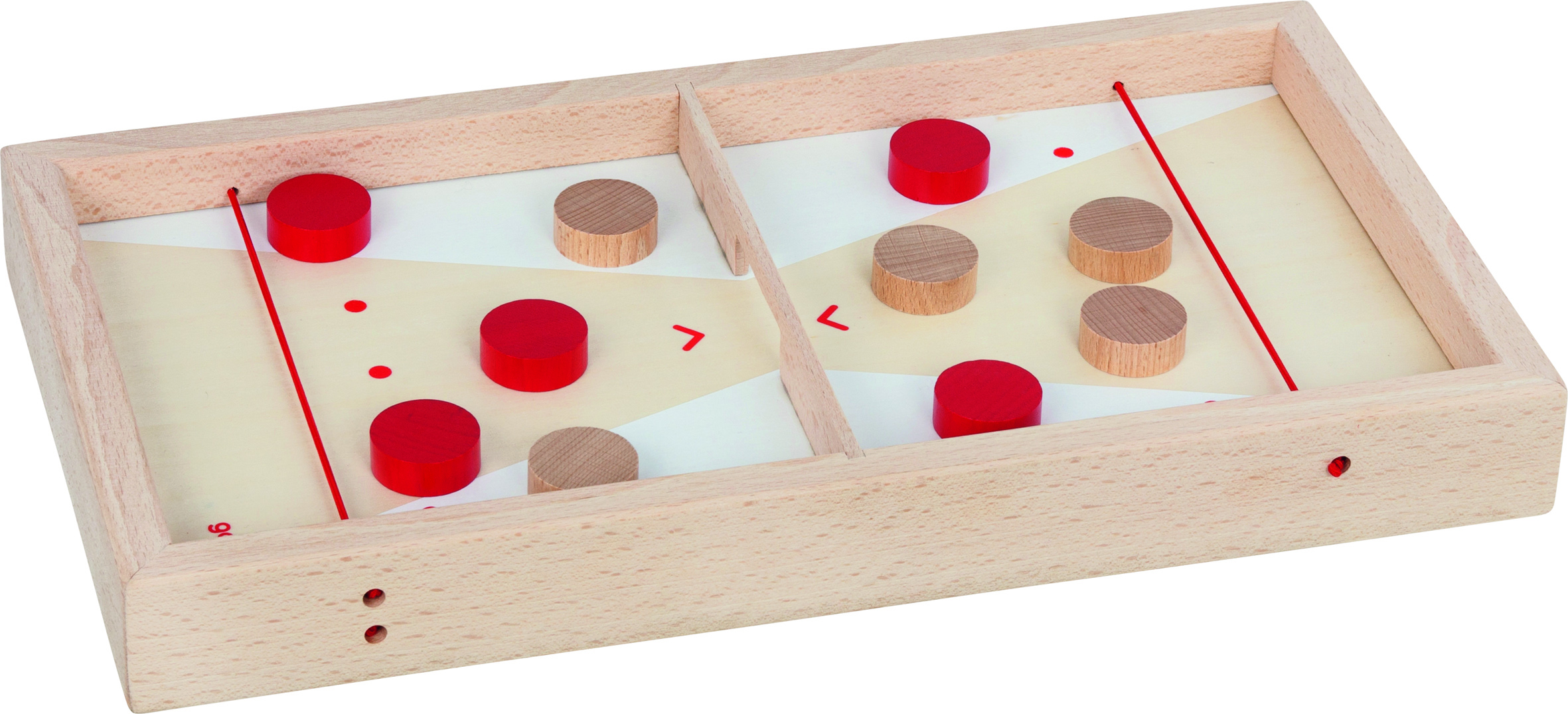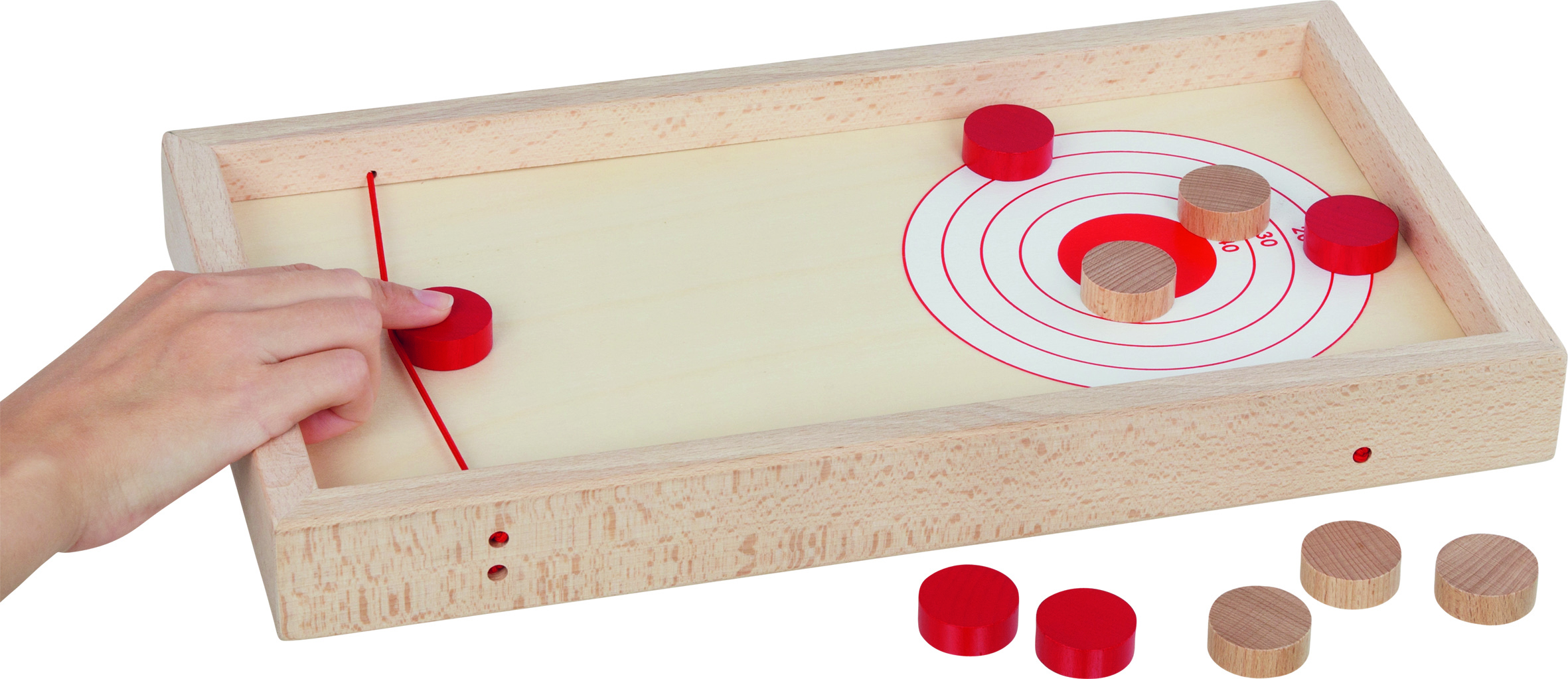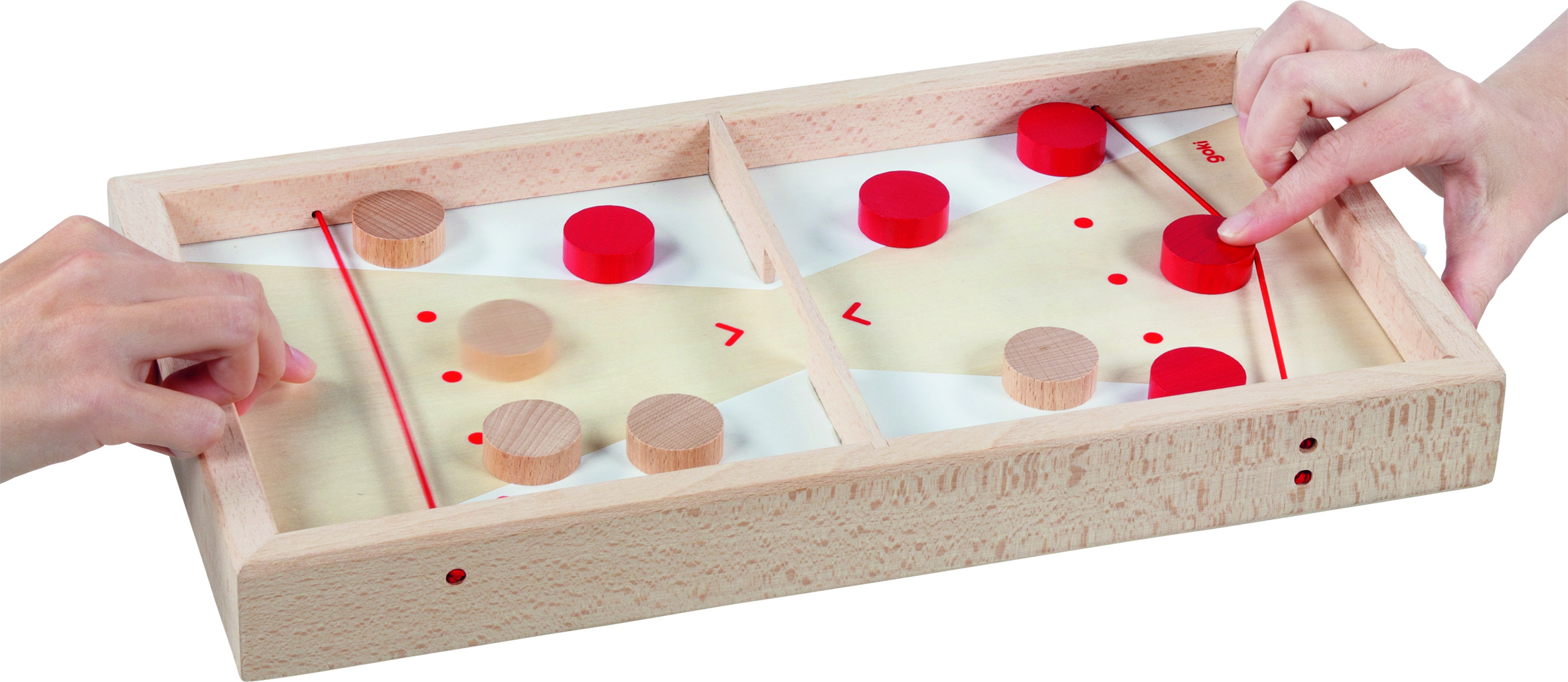 Das goki Puck-Spielbrett beinhaltet zwei spannende Spiele, die durch einfaches Wenden des Spielbretts schnell aufgebaut sind. Bei Super-Puck versuchen 2 Spieler, ihre Pucks so schnell wie möglich auf die gegnerische Seite zu schiessen. Beim Puck-Curling geht es etwas ruhiger, aber nicht weniger spannend zu - mit beliebig vielen Spielern gilt es, Ziele zu treffen und Punkte zu sammeln. Beide Spiele fördern die Hand-Auge-Koordination und das Konzentrationsvermögen.