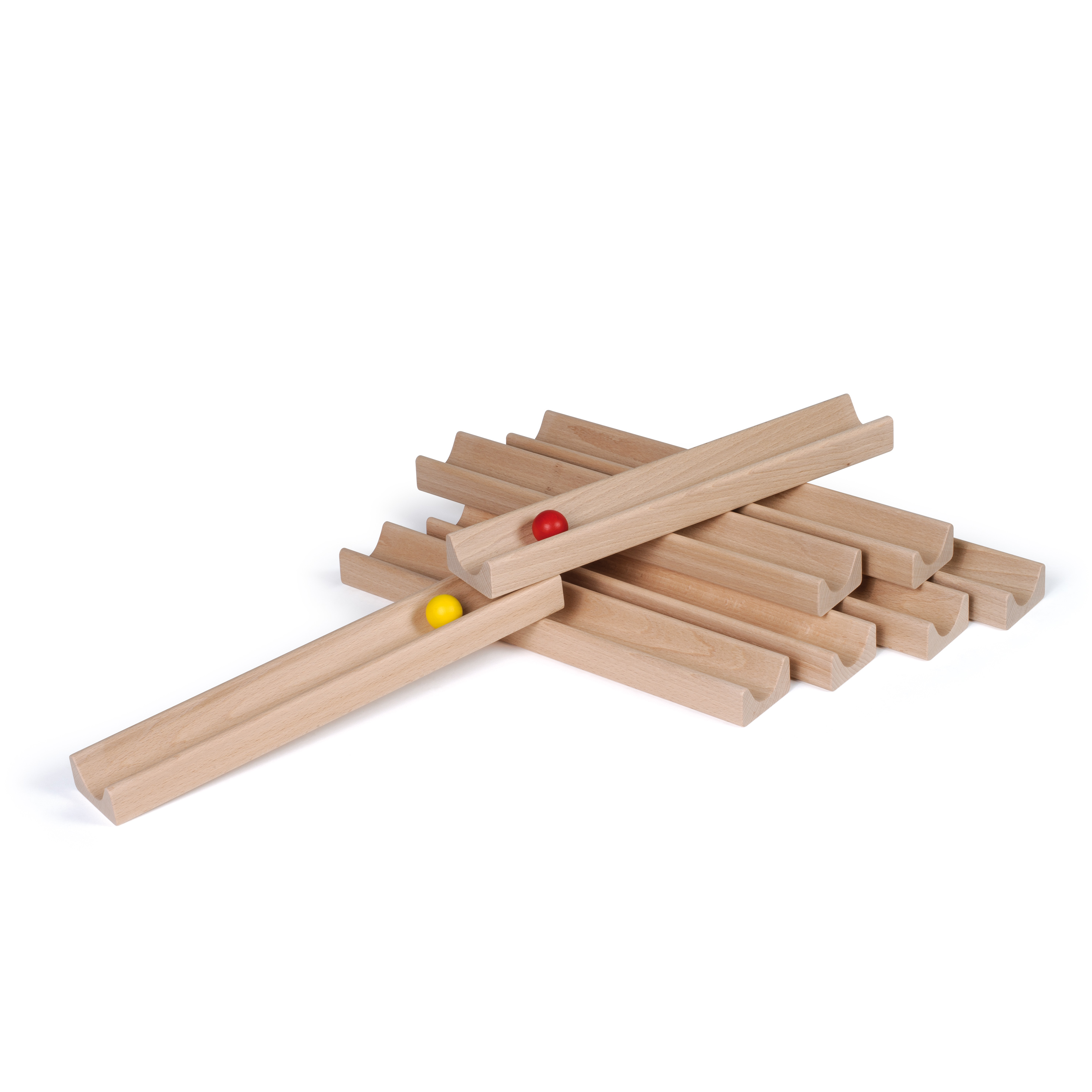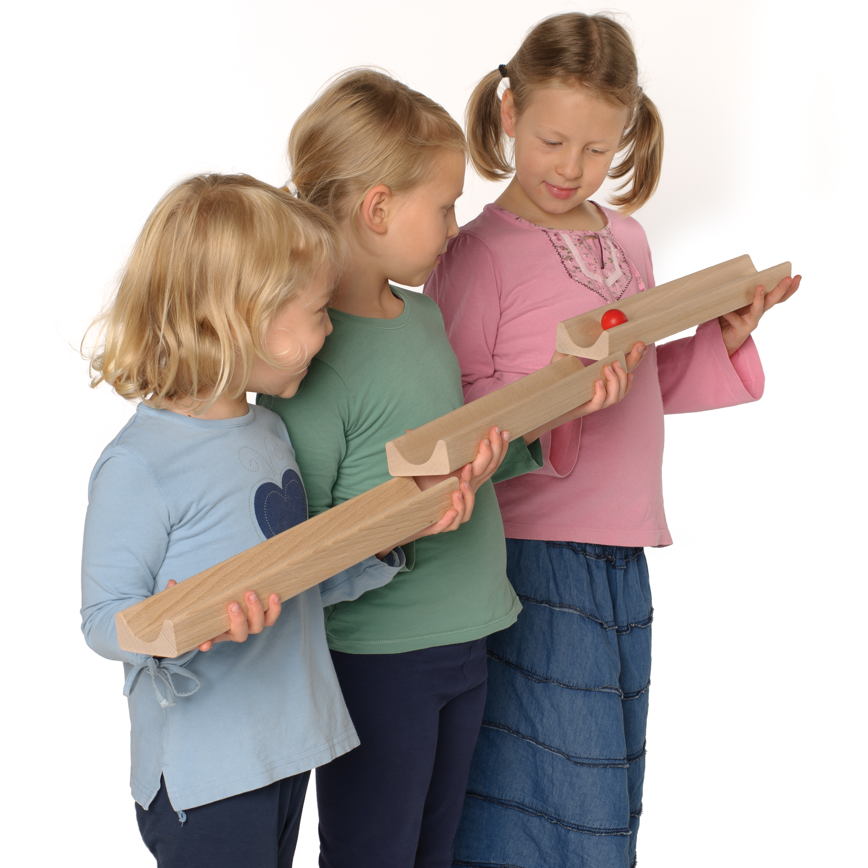 Die robusten Holzkugelbahnen bringen Teamwork zum Leben! Gemeinsam bauen die Spieler eine lange Strecke und halten die Kugeln in Bewegung. Das Ziel ist es, die Kugeln nacheinander von einem Punkt zum anderen zu transportieren, ohne dass sie herunterfallen. Geschicklichkeit, Konzentration und Koordination sind gefragt, um die Herausforderungen zu meistern. Durch Anpassung der Bahn können verschiedene Schwierigkeitsstufen erreicht werden, und es besteht sogar die Möglichkeit, Teams gegeneinander antreten zu lassen. Spass und gemeinsames Lernen sind garantiert!Inhalt: 8 Holzbahnen, 2 Holzkugeln, 1 Tragebeutel